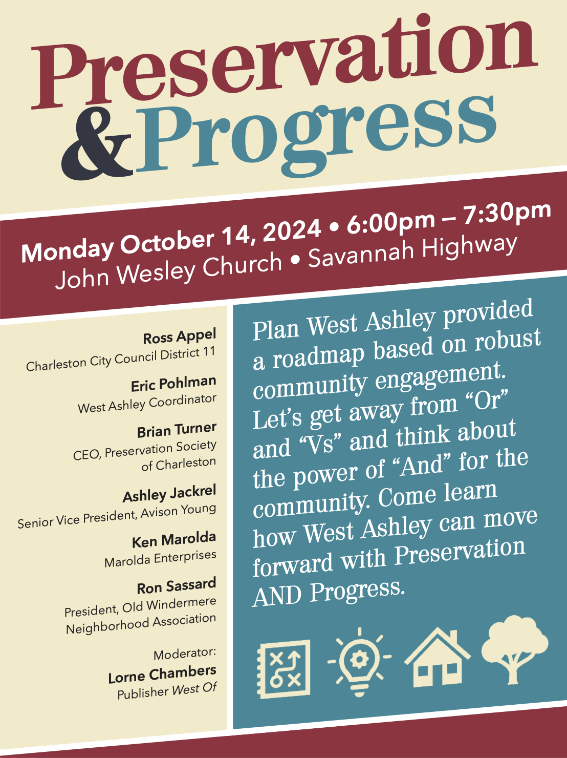 We hope interested parties can attend. This is a growing group of people supporting preservation efforts in West Ashley. There is an impressive list of speakers on the panel, including our OWNA President, Ron Sassard.
